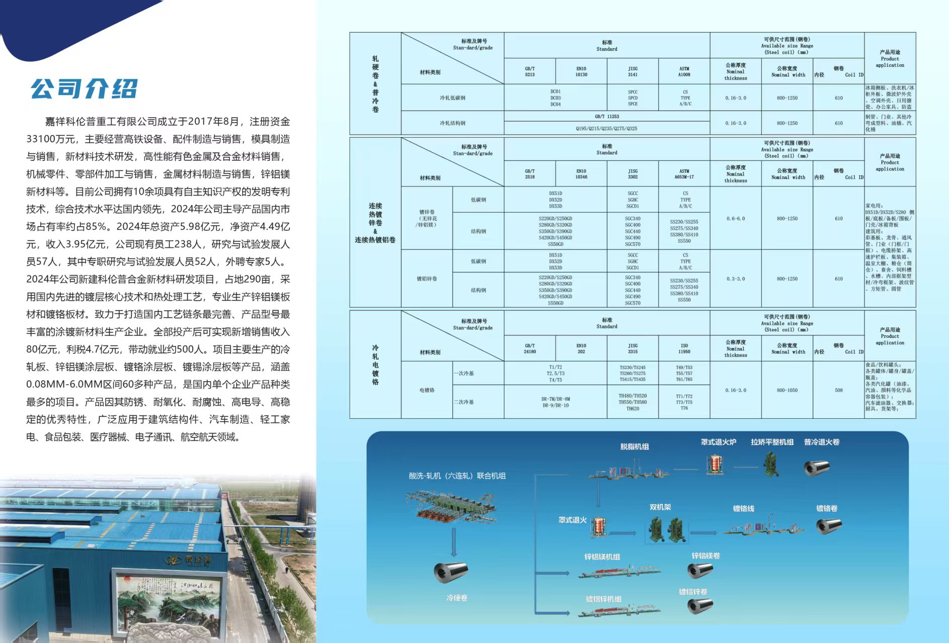 科伦普冷轧重工有限公司是设计年产量150万 吨,能向广大用户提供热轧酸洗、热轧镀锌、冷硬、罩式退火、冷轧镀锌、铝锌合金、锌铝合金、锌铝镁、镀铬等各大类产品。产品覆盖东北、华北、华东、华南等地区。